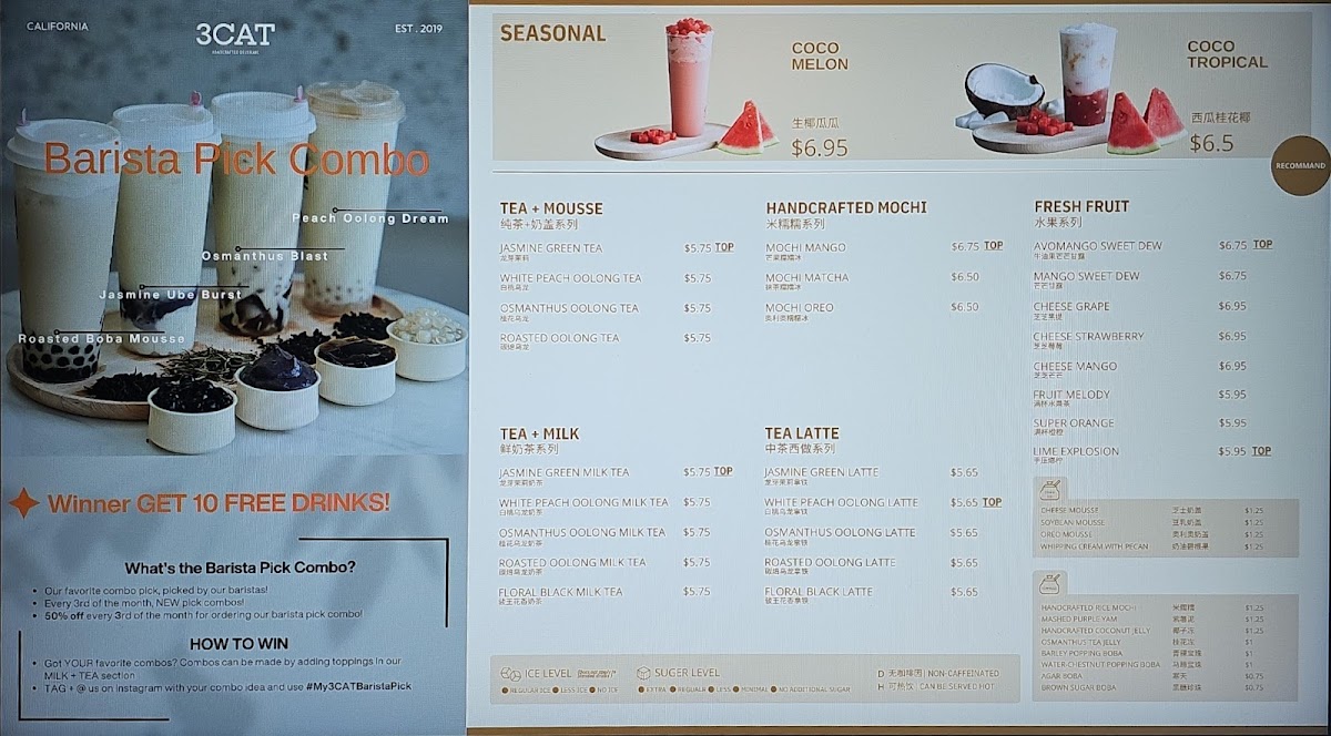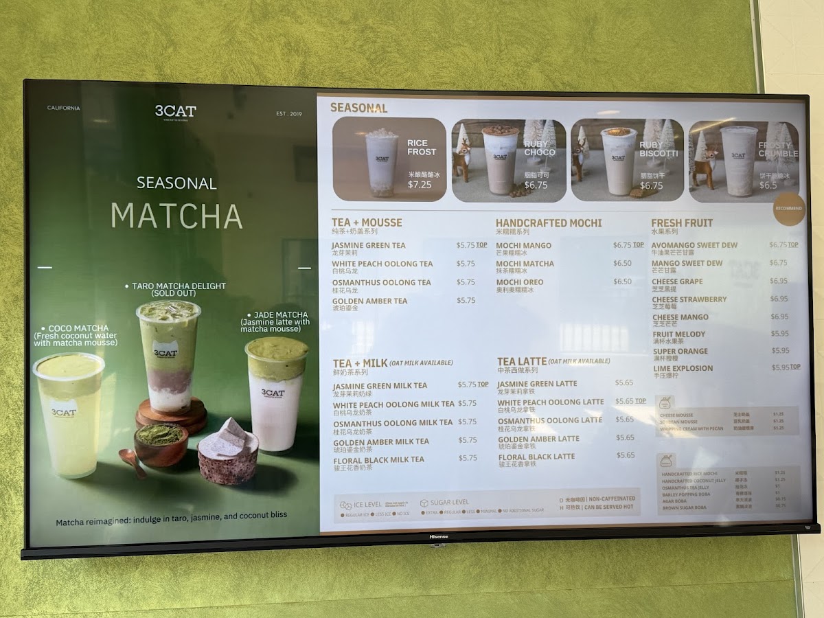 3CAT Handcrafted Beverage in the heart of Los Angeles’ Koreatown is a standout bubble tea destination known for its artisanal blends and fresh, balanced flavors. Their menu is a thoughtful mix of tea lattes, mousse teas, and classic milk teas, each crafted with premium ingredients like Straus organic milk and high-quality loose-leaf teas—including Floral Black, Dragon Well, Osmanthus Oolong, and Jasmine Green.